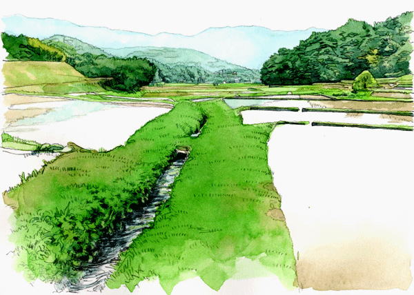 この絵の主役は手前の小さな小川としました。 そのため小川をしっかり描き、それ以外を淡い色でサッと描くことにより、春の柔らかな風景を表現することができました。 |