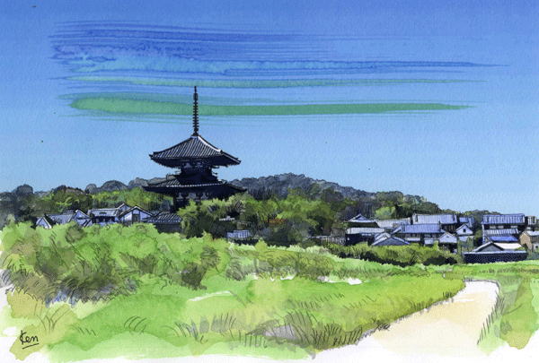この絵では緻密に描くより、あえて荒いタッチで描き、暗い部分を漆黒のまま残すことにしました。それにより空の「勝負の一色」の刷毛のタッチとの調和が図られると考えたからです。