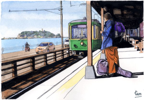 国道134号線のすぐ向こうは相模湾、ここはサーフィンのメッカでもあり、それらを眺めているとまもなく電車が到着します。「もっとゆっくりして来ればいいのに・・・」と電車を恨む駅なのです。